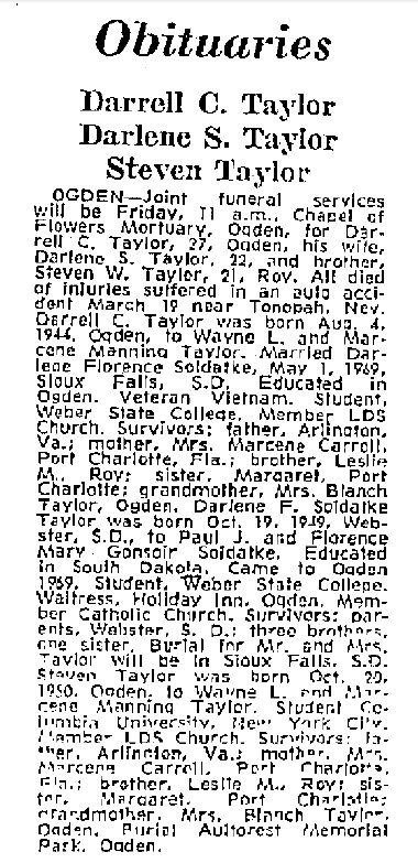 Darrell's younger brother, Steven Taylor, who was also killed in the accident, was born Oct. 20, 1950, in Ogden, also a son of Wayne L. and Marcene Manning Taylor.
